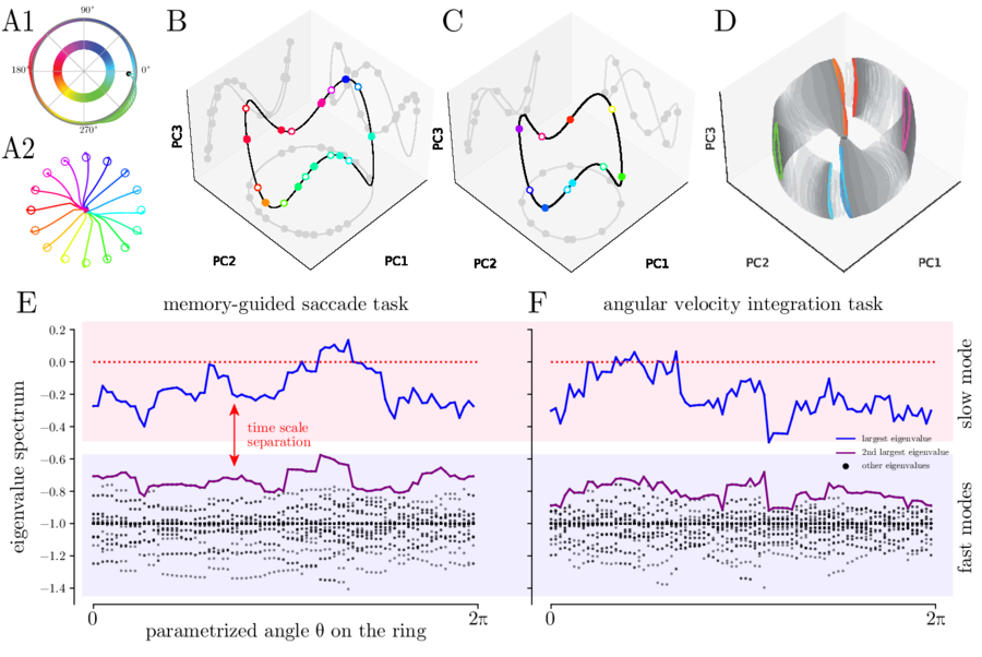 We also trained RNNs to perform tasks that require continous memory and found approximate ring attractors. Due to the noise injected to the internal state, and the stochastic gradient descent training, the solutions exhibit normal hyperbolicity (panel E below). Therefore, the RNNs can be shown to be near to the mathematically perfect continuous attractor.